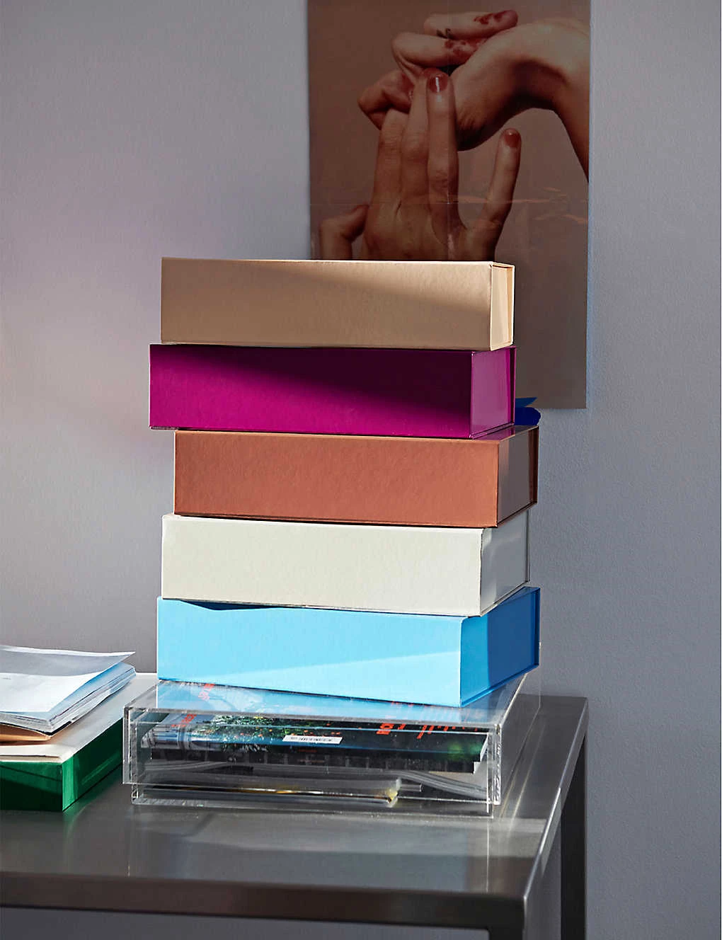 - Glossy finish, durable construction, rectangle shape, magnet-fastened lid, can be stacked